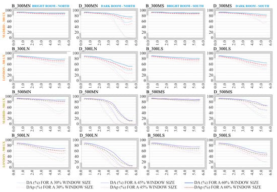 The first analysis addresses the divergence of the studied metrics with respect to the window size. Figure 4 shows the quantification of both metrics considering three window-to-wall ratios: 30%, 45%, and 60%. Odd columns represent bright rooms (B) with a high reflectance value of the inner surfaces, while even columns show dark rooms (D) according to the model described in Figure 4. First and second rows describe the calculation models with an illuminance threshold of 300 lx, while the third and last rows show rooms with a light requirement of 500 lx. Odd columns represent rooms located in Madrid, Spain and even columns show rooms in the London scenario. Finally, the first and second columns represent windows facing North and the third and fourth columns describe windows oriented to the South. The labels located in the left-top of the room sections describe the calculation model according to the parameters defined in Table 2.