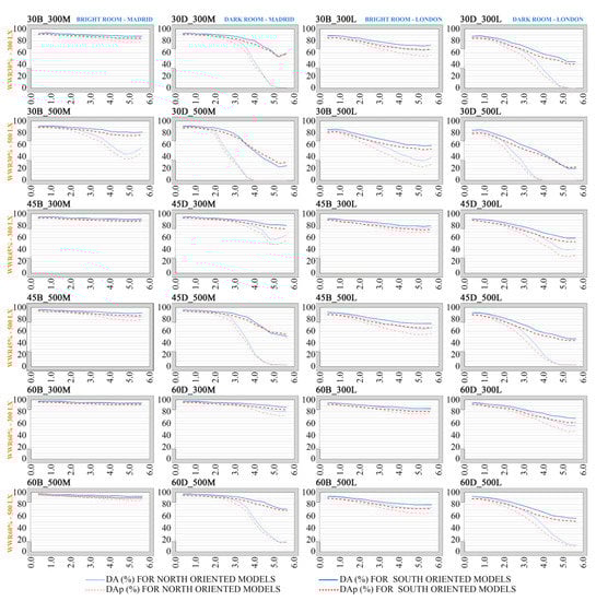 The second analysis assesses the difference between DA and DAp according to the window orientation. Figure 5 shows the results for both metrics in accordance with the methodology described above and taking into account two orientations, North and South. First and second rows describe the calculation models with a window to façade ratio of 30%, while third and fourth rows show medium-size windows and the last two rows describe the results for large openings. Odd columns represent rooms with a high reflectance of the inner surfaces and even columns show rooms with dark surfaces. Odd rows show the results of both metrics for an illuminance threshold of 300 lx, while even rows represent the opposite scenario, with a requirement of 500 lx. As in the previous trial, labels located in the left-top of the room sections describe the calculation model in accordance with parameters defined in Table 2.