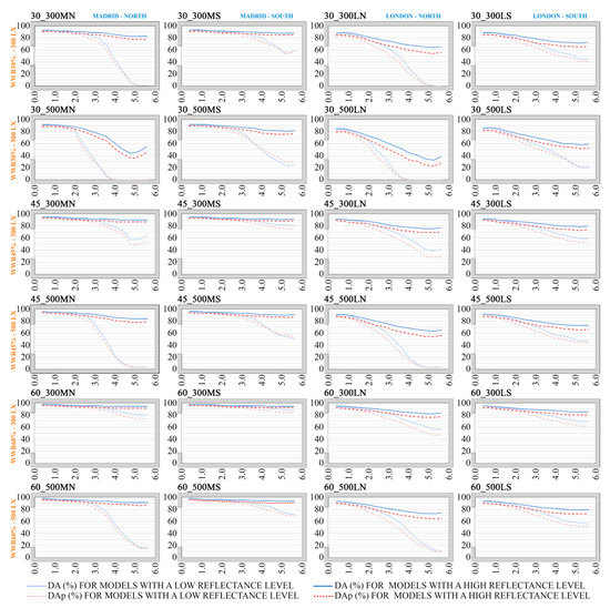 In the case of the comparison of the metrics according to the reflectance of the inner surfaces, DAp does not provide a noticeable deviation in comparison with DA (mean deviations of 5.1% for 300 lx and 8.1% for 500 lx). Thus, it is not a decisive parameter to determine the difference between both metrics.