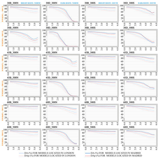 The last analysis quantifies the divergence of DA and DAp according to the different climate conditions of the room location: London UK, with mainly overcast skies and Madrid, Spain, with predominantly clear skies. It could be assumed that the differences of the climate conditions will affect to the use of daylight during the summer season, where DAp is ignoring most of the days in its calculation process. Figure 7 shows the results for both metrics according to the room location. As in the previous trials, the first and second rows show the room sections with a window-to-wall ratio of 30%, third and fourth rows show medium-size openings with a relative surface of 45% and the last two rows describe the results for large windows which correspond to a ratio of 60%. Odd columns represent bright rooms, with inner surfaces with a high reflectance value, while even columns show dark rooms. In addition, odd rows describe the results for an illuminance threshold of 300 lx, while even rows show the quantification of the metrics for the upper requirement of 500 lx. Finally, the left columns describe the results for windows facing North, while right columns represent the opposite orientation. As in previous studies, labels located in the left-top of the room sections describe the calculation model in accordance with parameters defined in Table 2.