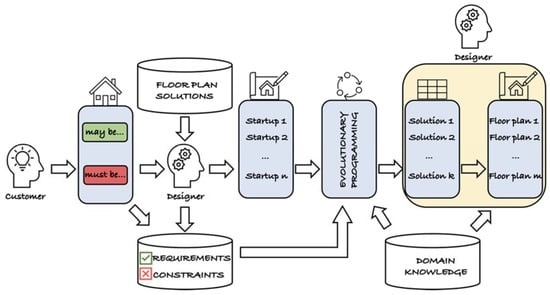 In the proposed framework for visual floor plan generation, early design solutions are generated based on the designer’s knowledge, and the design specifications are determined in collaboration with the customer. In these specifications, the required number of rooms, their areas and functions as well as the rules of their arrangement can be determined. Design constraints as well as many requirements (called hard ones) determined in the specifications are to be fully satisfied (e.g., ‘one room must be at least 27 m2’). Some other requirements are soft ones (i.e., they are to be fulfilled to some degree (e.g., ‘the kitchen should be big’)). There are also sharp requirements, the fulfillment of which would be desirable but is not absolutely necessary (e.g., ‘the wardrobe should be next to the main bedroom’) [27]. As most design problems involve several criteria, the weights determining their importance can be defined. Then, the quality of the generated solutions and the degree to which they meet the design specifications can be properly assessed.