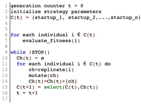 EP was developed to imitate the evolution of behavioral traits (i.e., to evolve a set of semi-optimal behaviors where the focus is on the phenotypic evolution instead of the genotypic one like in other evolutionary methods (e.g., genetic algorithms)) [34]. Thus, EP does not apply any recombination operators that exchange genetic material between individuals, and the search process is driven solely by mutation and selection. There is no single method of individual representation, like bitstrings in Holland’s genetic algorithms [26]. Instead, the representation is tightly connected to the current problem domain. The fitness function takes into account the environment of the individual and evaluates its behavior. The pseudocode of the basic evolutionary programming algorithm is presented in Figure 2. The proposed approach was implemented and reviewed using Python in the Jupyter Notebook, which is especially useful for interactively developing and visually verifying the ongoing evolutionary design process.