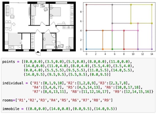 Representation: In our approach, we assume that all rooms in a floor plan are polygons. Thus, each room can be uniquely identified by a set of points P = {p1, …, pn} where pi = (x,y) ∊ R2,1 ≤ i ≤ n ∊ N. Each point represents the place where the walls of the rooms meet. Hence, individuals in our approach use a representation of a real-valued point sequence. In order to interpret such a sequence as a valid space plan, a preprocessing flood fill algorithm [35] is applied to determine the connected areas that constitute a room. In this way, the individual phenotype I is created in the following way: I = {‘R1’:[p11,p12, …, p1j_1], ‘R2’:[p21, …, p2j_2], …, ‘Rk’:[pk1, …, pkj_k]}, where R1, …, Rk denote recognized rooms and [pm1, …, pmj_m] is a sequence of points of all walls’ connections in a room Rm. The example floor plan, its simplified sketch with marked points and the actual representation are presented in Figure 3. Special points called immobile, which define the outline of the layout and as such cannot be changed by any evolutionary operation, are also indicated.
