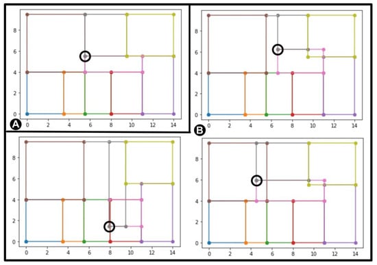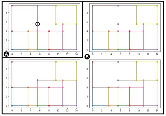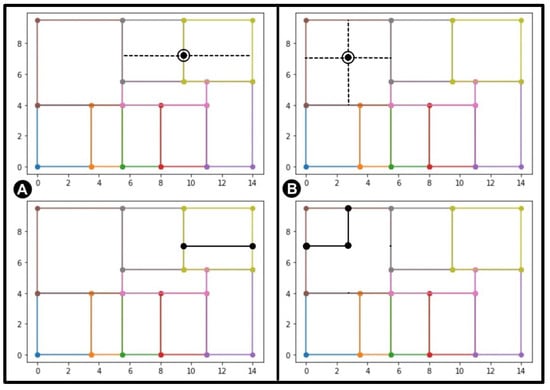 Mutation: The mutation operation is the only procedure that introduces variation in a population. In the early generations, it should dynamically explore the search space, and when the space is sufficiently covered, it should allow for exploiting the obtained results to fine tune them. The exploration–exploitation trade-off in EP is moderated by strategy parameters. So far, the static strategy has been implemented, which is the simplest one, where the value of deviation is fixed and there is one strategy parameter per operator. However, it is straightforward that in the future, it will have to be dynamically changed over the generation time and over the individual fitness value. The following mutation operators have been defined: a new point can be added, a point can be deleted and a point can be moved. The operators may be applied individually with a given probability or in a randomly selected sequence. Since we assume that, in most cases, the mutation generates feasible solutions, some accompanying actions for every mutation operator has to be performed. When adding a new point, two situations have to be considered: a new point is (1) on the existing wall or (2) inside a room. In the first situation, an additional point has to be added, and there are at most two different ways to do that (see Figure 4A). In the second one, at least a further two points have to be included (see Figure 4B). Deleting a point requires indication of another point connected to it by a wall, and these two points are deleted together (see Figure 5). Moving a point is the action that requires the most additional activities. After selecting a point to change, all the rooms that contain this wall connection are selected, and all walls are adjusted to a new (mutated) position. If there are still rooms that may become invalid after this translation and may have walls joined at an angle other than 90 degrees, an extra new point at the position before the mutation is added (see Figure 6).