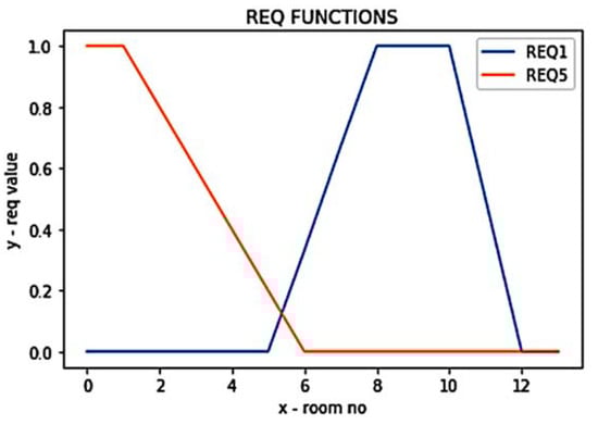 Figure 7. Requirement (REQ1 and REQ5) evaluation functions. - REQ2: The largest room should be bigger that 21 m2 and w2 = 0.7, Req2 ∊ {0,1}.