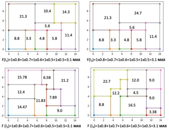 In Figure 8, there is a startup floor plan (I1) and three others obtained during the evolution (I2, I3, I4) with the highest possible value of the fitness function (F(I) = 3.1).
