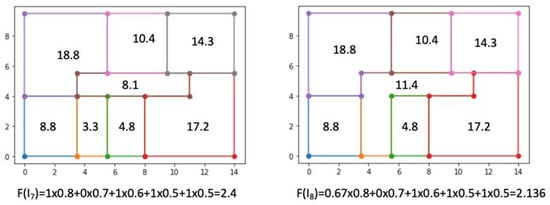 In Figure 9, there are two quite different floor plans that have very similar fitness values. Only one requirement, namely REQ2 (the largest room size), was evaluated differently and took the value of 1 for I5 and 0 for I6. The large number of spaces made Req1 equal to zero. Both plans had two spaces with areas lower than 2 m2, and therefore, Req5 had a value of 0.8. Thanks to this approach, we could achieve very large diversity in a highly adapted population of individuals. It is also worth stressing that both presented solutions were generated by a single application of the moving mutation to the start-up solution I1 (Figure 8). Thus, a considerable variety of individuals was already noticeable in the first generations.