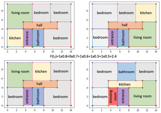 In Figure 10, two different floor plans that were very similar and were similarly evaluated are presented. Only one requirement, this time REQ1 (the number of spaces), was evaluated differently and had values of 1 for I7 and 0.67 for I8. In this case, the fitness value was in line with our intuition. The better evaluated individual I7 was more flexible and gave more freedom in assigning labels for determining the functions of spaces. Some of the possible assignments are presented in Figure 11. The possible assignments of space labels were created for floor layouts selected by the designer. He or she could also select the evaluation threshold value from 0 to 3.1 or the number of solutions to be presented on the screen.