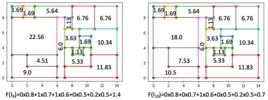 In Figure 12, two low-rated example layouts are presented, namely I9 and I10. Both arrangements qwre very similar: 16 spaces (Req1 = 0), a room larger than 7 m2 adjacent to the largest room (Req3 = 1), the largest room not being oriented toward the south (which was on one of the long sides of the building (Req4 = 0)) and 5 spaces with areas less than 2 m2 (Req5 = 0.2). However, there was one difference that had a huge impact on the individual fitness value: the fulfillment of the second requirement (REQ2) stating that the largest room should be bigger than 21 m2. This requirement was met by the solution I9, and taking into account the assigned importance coefficient (0.7), it yielded a solution twice the value of the fitness of the solution I10. This is a good example of how sensitive the results were to the values assigned to the coefficients used while blending requirement fulfillment.