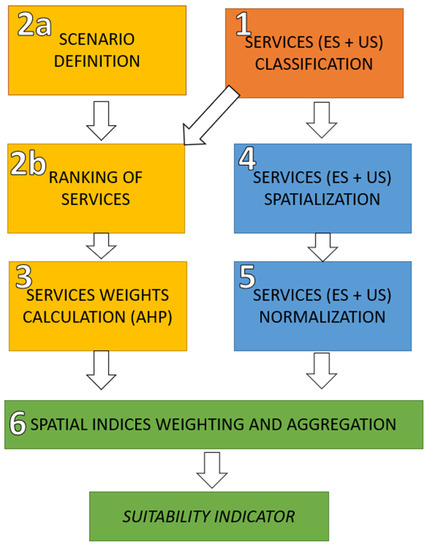 SUSAM was developed in seven steps (Figure 2): (1) definition of a hierarchical classification including ES and US; (2a) definition of verisimilar scenarios and (2b) service selection and ranking; (3) attribution of relative weight to each service based on AHP. Then, steps dedicated to the spatialization of services in the area were performed: (4) spatial modelling of SBA and (5) normalization of services ranges into the study area. Finally, the final suitability index was obtained from the last step (6) oriented to weighting and aggregation of the spatial indices. Processes oriented to spatial analysis (Figure 2, in blue) and service ranking (Figure 2, in yellow) can be carried on parallelly, as they are independent of each other. In SUSAM, AHP is applied unusually, as steps 2 and 3 are typically developed in reverse order. This reversion, in this application, is necessary because, in the design of the scenarios, the service ranking (i.e., their order) is defined, while their relative importance (i.e., the difference between their importance) can only be estimated.