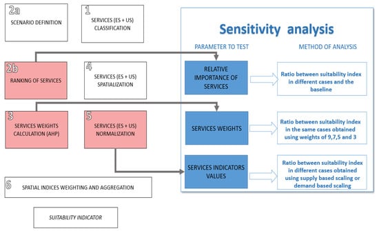 A landscape suitability assessment model should be sensitive to variations of judgements, while it should be pretty resistant to the indicators’ variation. Thus, an extensive sensitivity analysis appeared very important to understand the level of responsivity of SUSAM to the variation of preferences about services and the variation of the indicators’ level. In this direction, we considered the three main factors mainly influencing results variability in a typical S-MCDA model [42]: (1) service indicators values, (2) relative importance of services, and (3) service weights. To test sensitivity for each scenario, we fixed the different parameters of the model, varying one of the variables (Figure 3). Couples of suitability index outputs were compared by calculating ratios per landscape class to understand better the entity and the localization of the effect of the varying parameter on the results.