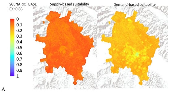 In the AHP, indicators are usually scaled between 0 and 1 to be comparable and integrable with their relative weights possible. To this purpose, service indicators can be scaled using different methodologies based on the purpose of the study. In this work, to calculate suitability, the model was run using two linear scaling approaches: the supply-based scaling, according to which 0 was associated to the minimum value of the indicator, and 1 to the maximum value of the indicator in the study area; the demand-based scaling, according to which 0 was associated to the minimum level of the indicator required by the demand and 1 to the values of the indicator able to meet the demand completely. The former method was targeted at expressing the relative quantity of service supply. In this case, each indicator is scaled between its minimum value and maximum value in the study area. So, the resulting indicator has only a relative value clearly expressing the differences within the area in terms of supply and is not comparable with other study areas. Differently, with the latter method, indicators were scaled based on demand-driven minimum and maximum to obtain indices potentially comparable with other areas.