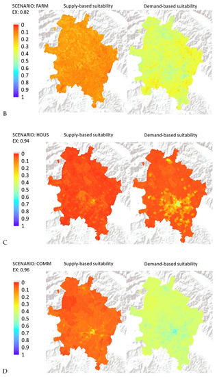 Maps from SUSAM application in the different scenarios. (A): BASE, (B): FARM, (C): HOUS, (D): COMM, (E): INF, (F): NINF, EX: explained suitability (scenario codes are described in Table 2).
