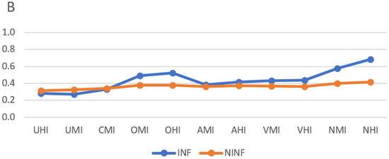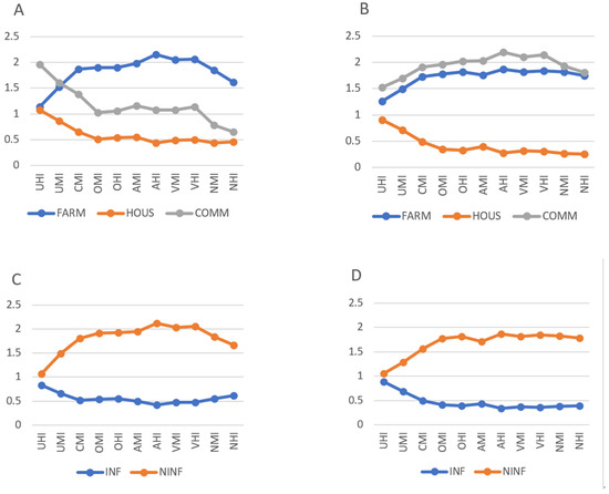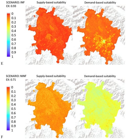 When SUSAM is applied to produce maps for identifying the areas that need infrastructures (INF), results show that the more urbanized areas (UHI, UMI, and CMI) typically need roads and transport infrastructures. This tendency appears more evident when demand-based scaling is applied. Similarly, the suitability of natural landscapes (NHI and NMI) to roads and transport infrastructures is also high, since they deliver services that can only be benefited in loco. On the other side, when the areas with no need for infrastructures are highlighted (NINF), the suitability shows higher values in all the landscapes. However, the percentage of explained suitability is relatively lower (0.73). In this case, agricultural and natural landscapes produce more directly delivered services to the use regions than urban landscapes (UHI, UMI, and CMI).