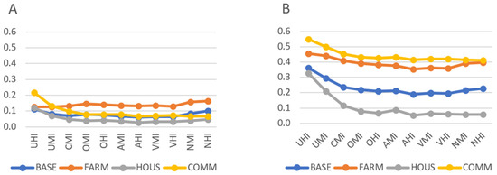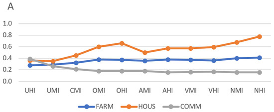 The supply-based and demand-based values of suitability for the commercial activity scenario (COMM) are also increased by the landscape’s urban component, particularly by the main roads and fast internet connection. The highest levels of this kind of suitability appear in the UHI landscape, where the demand-based SI reaches 0.66, which is the maximum value reached by the indicator in the whole study area. The explained suitability is high in each case, ranging between 0.81 and 0.96.