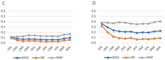 Ratios between suitability indices and their baselines calculated for the different scenarios and for each landscape class (descriptions of landscape classes’ codes are reported in Table 1, scenario codes in Table 2). (A,B): economic perspective, (C,D): infrastructure perspective. (A,C): supply-based suitability, (B,D): demand-based suitability.