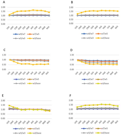 Average ratios between suitability indices of economic activities’ scenarios calculated using different weights for each landscape class (w9/w7: 9 on 7, w7/w5: 7 on 5, w5/w4: 5 on 3, w3/base: 3 on the baseline). (A,B): FARM scenario; (C,D): HOUS scenario; (E,F): COMM scenario. (A,C,E): supply-based suitability; (B,D,F): demand-based suitability; Descriptions of the landscape classes’ codes are reported in Table 1, scenarios’ codes in Table 2.