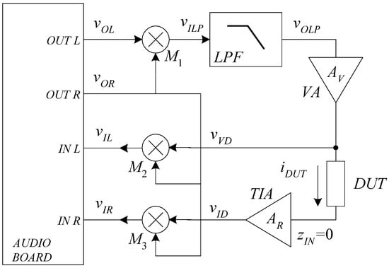 where fLF is the frequency at which we want to measure the impedance of the DUT and ADC, φDC and ALF can be used to set the level of the DC bias and the amplitude of the sinusoidal signal at fLF, as will be apparent in the following. Starting from Equations (1) and (2), at the output vILP of the multiplier M1 we have: