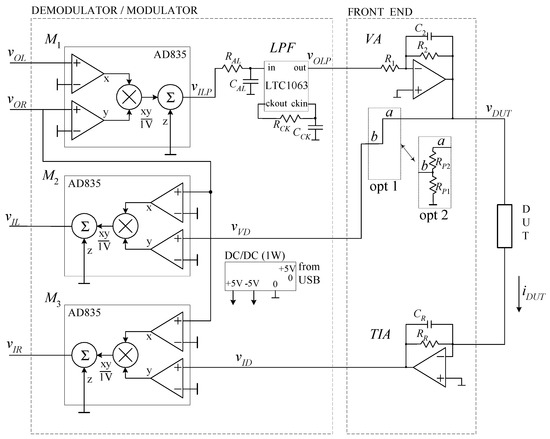 The multipliers M1, M2, and M3 in Figure 1 are implemented by resorting to the three identical monolithic four-quadrant multipliers AD 835 [37] that require essentially no external component for their operation (save for the power supply decoupling capacitors not shown in the figure). The Low Pass Filter (LPF) is implemented by resorting to a switched capacitor fifth-order Butterworth filter (LT1063 [38]) configured in self-clocking mode (RCK = 50 kΩ and CCK = 200 pF) to obtain a corner frequency of 1 kHz. The passive low pass filter RAL CAL (RAL = 10 kΩ, CAL = 47 nF) acts as an anti-aliasing filter with almost no influence on the response of the system. The Demodulator/Modulator section is supplied by a miniaturized DC/DC converter supplied by the USB port of the personal computer. Depending on the required voltage range and current capability required by the DUT to be characterized, the same DC/DC converter can be used for the front-end section. Since the input and output dynamic ranges for the AD835 are limited to ±1 V and kV = 1 V−1, this means that the instantaneous value of in Equation (3) must remain within ±1 V. Since the passband gain of the LPF is 1, this means that the instantaneous value of cannot exceed ±500 mV. The amplifier VA can be used to extend the range of with respect to . However, when the circuit configuration corresponding to “opt 1” (Figure 2) is employed, since is also at the input of the multiplier M2, cannot exceed ±1 V. If larger voltages are required across the DUT, as it is often the case, the configuration corresponding to “opt 2” (Figure 2) must be used, where the voltage divider RP1 − RP2, if properly designed, allows the voltage to remain within the input dynamic range of the multiplier M2. Note that the block diagram in Figure 1 corresponds to the case in which “opt 1” in Figure 2 is used. When “opt 2” is used, the presence of the voltage divider can be easily incorporated in Equations (6)–(16). The frequency response AV of the amplifier (Equation (5)) is characterized by the following parameters: