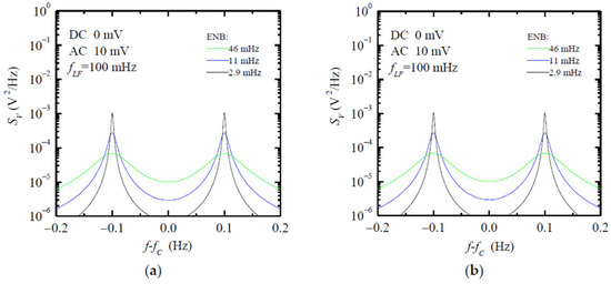 Spectra estimated by QLSA in NB mode when synthetic data are used for creating the signal VOL in Equation (2) with different settings for ENB. In (a) the DC level of the test signal across the DUT is set to 0, while in (b) we set a DC level of 100 mV across the DUT.