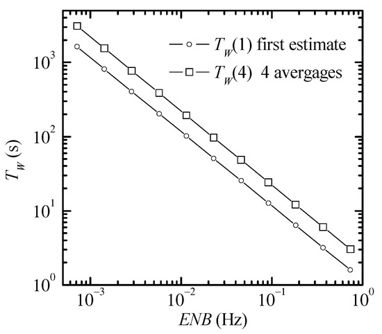 When a deterministic sinusoidal signal is present, as in the situations in Figure 4, only a small number of averages are usually required. To provide a better sense of the measurement time required in each case, the wait times for the first estimate (TW(1)) and the wait time after four averages (TW(4)) vs. the ENBs in Equation (22) are reported in Figure 7.