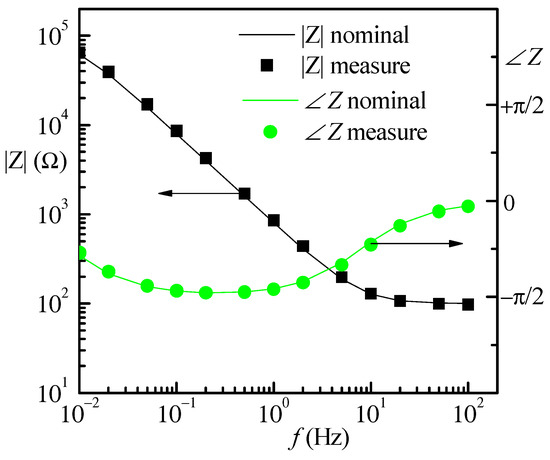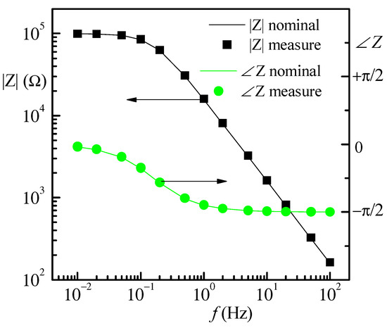 A second set of test measurements was performed on the test impedance in Figure 6b. The 200 μF capacitor was obtained as the parallel of 20 10 μF polyester capacitors. The amplitude for the AC signal was still 10 mV, but in this case, a DC bias of 500 mV was also present with the carrier removal block in Figure 3 active to reduce the leakage from the peak at the carrier frequency. As before, as can be noted in Figure 9, a quite good agreement is obtained between measured data (symbols) and expected values (continuous lines).