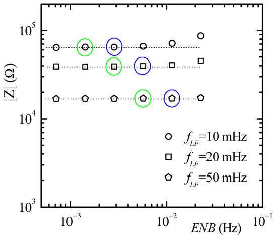 As we have mentioned above, the values of the impedance reported in Figure 8 and Figure 9 were extracted from the spectra estimated with the largest available ENB for which ENB < fLF/5. It must be noted, however, the QLSA performs the calculation of the spectra corresponding to all the different available ENBs in parallel. This means, for instance, that even if we focus on ENB10 for fLF = 10 mHz, as in the example discussed above, spectra corresponding ENB9, ENB8, and so on are being calculated as well and, because of Equation (23), estimates corresponding to lower index ENBs become available before the first estimate for a higher index ENB is available. This means that by observing the estimates obtained for lower index ENBs as they become available, if consistent data are obtained for increasing indexes, one can stop the measurement before the estimate for the targeted high index ENB is obtained, thus saving time. This is exemplified in Figure 10 where the estimate of the modulus of the impedance of the DUT in Figure 10 is reported for the three lowest frequencies vs. ENB. The symbols encircled in green represent the measurement points reported in Figure 9 and corresponding to ENB < fLF/5. If one had to build the sequence of symbols corresponding to one of the measurement frequencies in Figure 10 in real time during the measurement, the symbols at the right would become available first, followed by the symbol at their left and so on until enough time is elapsed for the estimation corresponding to the leftmost symbols to become available. In observing each sequence of symbols as they become available, it could have been assumed with great confidence that the symbols encircled in blue would have represented the correct value of |Z| even before the symbols encircled in green (the ones actually used in Figure 9) would have become available, thus saving measurement time. The ability to monitor the progress of the estimation over a number of different ENB settings at the same time is a peculiar feature that is available in QLSA and that, to the best of our knowledge, has no equivalent in other measurement approaches. Proper application software can therefore be developed, based on this unique feature, to optimize measurement time while ensuring the absence of errors due to spectral leakage.