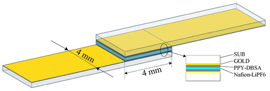 Following the preliminary tests, performed on well-known DUTs and intended to verify the soundness of the approach we propose, we performed the characterization of a prototype supercapacitor using symmetric electrodes based on polypyrrole (PPY). In common with other conjugated polymers, PPY has alternating single and double carbon-carbon bonds and the ability to undergo electrically driven reversible transition between its oxidized and reduced form, which has been exploited in actuators emulating artificial muscles [43], in electrochromic windows [44], and in a variety of applications going from electrochemical sensing [45,46] to energy storage and conversion [47,48,49,50,51,52]. Conducting electrodes to be used in electrochemical energy storage devices can be developed starting from commercially available insoluble PPY powder, as we attempt to do here, or by using PPY polymerized from its monomer and doped, or by combining PPY with a variety of other materials including nanostructured carbon and metal oxides, to yield nanocomposites with tailored electrical, and electrochemical properties [53,54,55]. Because of their electrochemical activity, electrodes based on PPY and its nanocomposites, when applied in a planar supercapacitor configuration, namely when impregnated with an electrolyte and separated from another electrode through an ion-permeable medium, confer to the device a faradaic character. Meaning that the energy storage mechanism in supercapacitors having PPY based electrodes is not only the electrically driven absorption-desorption of anions and cations at the electrodes, as is the case in electric double layer capacitors but is also the occurrence of fast redox transition at the surface of the PPY electrode, as it happens in the so-called pseudo-capacitor. The performance of each supercapacitor, which strictly depends on the composition, and on the structural, electrical, and electrochemical properties of its electrodes, can be evaluated using impedance spectroscopy, and low frequency measurements provide important information on the device characteristics. The DUT examined here is a flexible symmetric pseudo-capacitor developed using a substrate transparency sheet having a gold film evaporated in a vacuum on the top. The electrode material is obtained as a clear aqueous suspension by diluting in deionized water the doped polypyrrole (PPY) powder (purchased from Aldrich, Merck KGaA, Darmstadt, Germany) dispersed in Dodecylbenzenesulfonic acid (DBSA, 70% in isopropanol, Aldrich), at a ratio of 1:4 by weight. The PPy-DBSA dispersion is used as ink to fill rechargeable pens and is applied on the top of the gold-coated transparency. After few minutes of storage at about 60 °C to remove the residual solvent, a layer deposited from a mixture of 300 mg of lithium hexafluorophospate (LiPF6) and 3 mL of Nafion (D2029, purchased from Ion Power GmbH, Terminalstraße Mitte 18, München, Germany) in 10 mL of ethanol, is applied on the top of the PYR-DBSA electrode. After this latter layer is left to dry slowly, an ion-permeable Nafion membrane impregnated with the lithium salt, forms on the PYR-DBSA electrode. At this stage, the transparency sheet is cut into a couple of pieces that are faced to each other and stored at about 60 °C for a few tens of seconds, in order to achieve adherence of the two pieces. The developed device is a symmetric system the schematic view of which is shown in Figure 11.