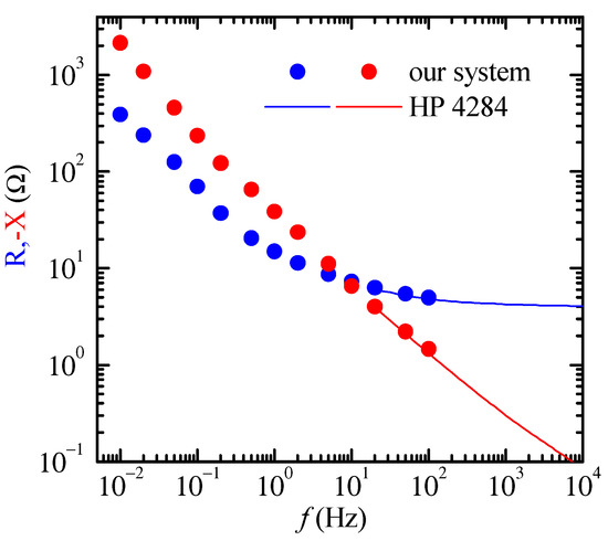 Real (R) and imaginary (X) part of the impedance of the device in Figure 11 as measured by the system proposed in this paper (symbols, from 10 mHz to 100 Hz) and as measured using an HP 4284 LCR meter (solid line, above 20 Hz).