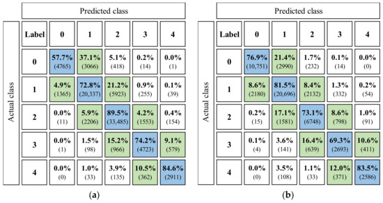 Confusion matrices of the method based on ground motion intensity measures: (a) LightGBM (prediction accuracy = 73.7%); (b) XGBoost (prediction accuracy = 67.4%).