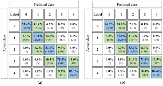 Figure 13 shows the confusion matrices for buildings with different fortification levels, which also exhibit approximately 80% accuracy for all scenarios. The above results show that the prediction accuracies of most classes are around 80%, and more than 90% of the predicted damage states are within one level difference to the actual damage states. Nevertheless, the prediction accuracies of some individual classes are below 70%. Note that the number of samples is small for classes with below 70% accuracy, which indicates that the proposed method can reasonably predict the seismic damages for most cases, and further studies are needed to improve the prediction accuracies of some individual classes.