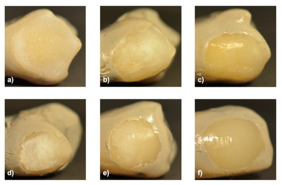 Figure 5 shows the demineralizing site after 96 h of acidic treatment. The teeth in the 37% orthophosphoric acid solution and some of those immersed in lactic acid lost their entire enamel layer, and the dentine was completely visible. The other dental crowns had patches of exposed dentine, except for those treated with the acetic acid solution, which exhibited only superficial alterations.