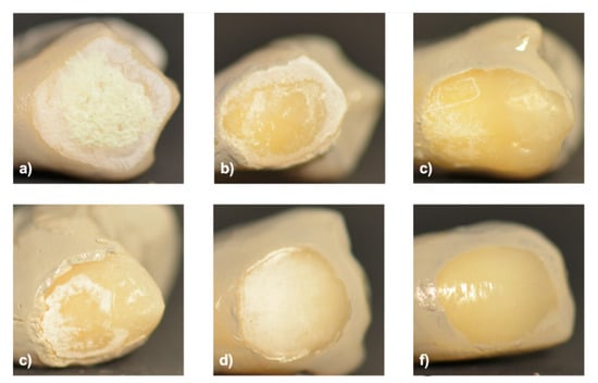 After 1 h of acidic treatment, the aspect of the enamel became more matte and chalk-like, except for the teeth treated with the acetic acid solution (shown in Figure 3).