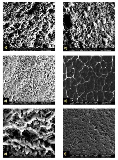 The SEM aspect of the teeth demineralized for 96 h in: (a) hydrochloric acid; (b) orthophosphoric acid; (c) lactic acid; (d) orthophosphoric acid solution; (e) formic acid; (f) CaCl2, NaH2PO4 and acetic acid solution.