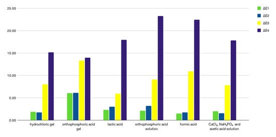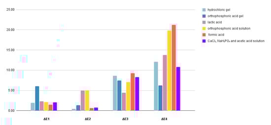 Statistical analysis was performed in order to compare the ΔE values obtained for the same demineralizing intervals and in different acidic solutions. For the ΔE1, the ANOVA one-way test showed a statistically significant difference (p = 0.0354) between the formic acid–orthophosphoric acid gel and CaCl2, NaH2PO4 and acetic acid solution–orthophosphoric acid gel. In ΔE2, a statistically significant difference was found (p = 0.25443) but without differences in the Tukey test. Regarding ΔE3, the ANOVA test showed no statistically significant difference (p = 0.25443) between any of the demineralizing solutions. In ΔE4, a statistically significant difference was found (p = 2.12339 × 10−9), except for the comparison between the lactic acid–hydrochloric gel; formic acid–orthophosphoric acid solution; and CaCl2, NaH2PO4 and acetic acid solution–hydrochloric gel.