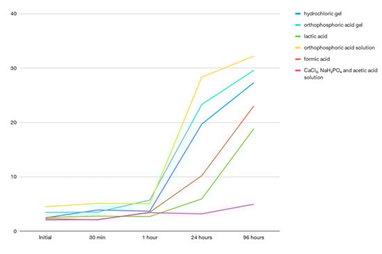The only demineralizing solution that presented a statistically significant difference with p = 0.02042 for the ANOVA test and no difference for the Tukey test was the orthophosphoric acid gel. The lactic acid and orthophosphoric acid solution showed statistically significant differences for all the time intervals, except for the first two: between the initial state and 30 min, and between the initial state and 60 min. For the hydrochloric gel; formic acid; and CaCl2, NaH2PO4 and acetic acid solution, the ANOVA one-way test presented statistically significant differences (p = 7.21066 × 10−7, p = 5.59125 × 10−9 and p = 1.03103 × 10−7) for all the time intervals, except for the first one (between the initial situation and after 30 min).
