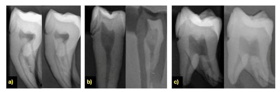 Analyzing the X-rays, no noticeable radio-translucency was found on the surface of the dental enamel of the teeth treated for 30 min and 1 h with different acid solutions. Radiologically, one can observe a major demineralization of the dentine and the complete absence of dental enamel on the teeth immersed for 24 and 96 h (mostly on those treated with liquid 37% orthophosphoric acid). This is shown in Figure 10b.