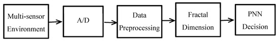 The left side of Figure 1 includes two models: a single PNN classifier model (namely, without data-fusion tactics, after fractal features extraction to make PNN decision directly, as shown in Figure 2) and an eigen-level data-fusion model. The essential difference between them is the process of having data fusion or not. Meanwhile, on the right of Figure 1, it shows the details of decision-level data-fusion model. This makes decisions based on data fusion of multiple single-PNN classifiers, as the eventual damage detection results output.
