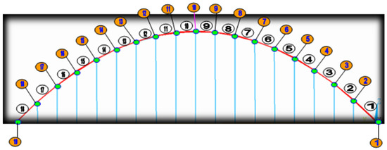 Considering the symmetry of the bridge, we used a rib of the arch bridge for research (as shown in Figure 6), hollow digital stands for rib element, solid digital stands for rib node, and the rib is divided into 18 elements and 19 nodes (as shown in Figure 6); ①–⑱ are the number of elements and 1–19 are the node numbers.