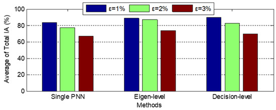 Third, the performance of single PNN classifiers was improved remarkably in the proposed system by data-fusion. For example, among these three single classifiers, the total IA of PNN Classifier 2 was the lowest, namely, 81.5%, 73.5% and 64.25% when ε = 1%, 2% and 3%, respectively. Moreover, through the processing of data-fusion, the IA were enhanced for eigen-level fusion models at different noise levels. The same conclusions were also found in the decision-level models.