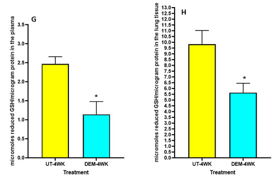 Plasma MDA levels were elevated in the DEM treatment group at 4 weeks post-infection and significantly increased at 8 weeks post-infection compared to the untreated control group (Figure 4A,B). DEM-treated mice may have experienced this increase in oxidative stress due to excess free radical production in the plasma after GSH diminishment.