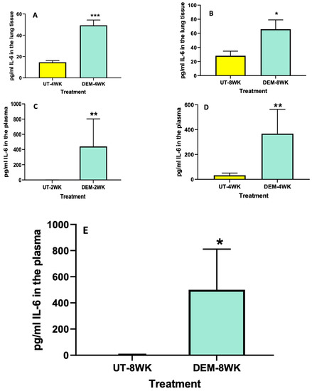 Measurement of IL-6 in the lung lysates and plasma of M. tb infected mice that were sham-treated or treated with DEM. IL-6 levels were measured in the lung lysates at 4 weeks (A) and 8 weeks (B) post-infection and in the plasma at 2 weeks (C), 4 weeks (D), and 8 weeks (E) post-M. tb infection. Statistical analysis was performed using GraphPad Prism software. Unpaired t tests were performed using Welsch correction. All values reported are representative of the mean values for each respective category and a p-value of <0.05 was considered significant. Any placement of an asterisk (*) denotes a direct comparison of the DEM-treated versus the untreated category. ** p-value < 0.005. When three asterisks are represented (***), a p-value below 0.0001 is implied. The sample size (n) includes six mice each in the untreated and DEM-treated groups.