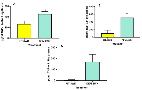 We also observed a significant increase in the levels of TNF-α in the lung lysates of M. tb-infected mice treated with DEM at 8 weeks post-infection (Figure 3A) compared to the sham group. Likewise, measurements of the plasma of M. tb-infected mice treated with DEM also indicated a significant increase in TNF-α levels in the 4-week (Figure 3B) group compared to the sham group. An increase was also noted in the 8-week group, although not significant (Figure 3C). These results are comparable to the IL-6 measurements and suggest the synergistic function of these cytokines in immune system regulation.