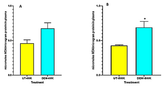 Measurement of MDA in the lung lysates and plasma of M. tb infected mice that were sham-treated or treated with DEM. MDA levels were measured in the plasma at 4 weeks (A) and 8 weeks (B) post-M. tb infection. Statistical analysis was performed using GraphPad Prism software. Unpaired t tests were performed using Welsch correction. All values reported are representative of the mean values for each respective category and a p-value of <0.05 was considered significant. Any placement of an asterisk (*) denotes a direct comparison of the DEM-treated versus the untreated category. The sample size (n) includes six mice each in the untreated and DEM-treated groups.