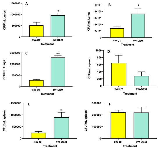 Survival of M. tb in the lung and spleen of mice that were sham-treated or treated with DEM. Survival of M. tb was determined in the lung lysates at 2 weeks (A), 4 weeks (B) and 8 weeks (C) post-infection and in the spleen lysates at 2 weeks (D), 4 weeks (E) and 8 weeks (F) post-M. tb infection. Statistical analysis was performed using GraphPad Prism software. Unpaired t tests were performed using Welsch correction. All values reported are representative of the mean values for each respective category and a p-value of <0.05 was considered significant. Any placement of an asterisk (*) denotes a direct comparison of the DEM-treated versus the untreated category. ** p-value < 0.005. The sample size (n) includes six mice each in the untreated and DEM-treated groups.