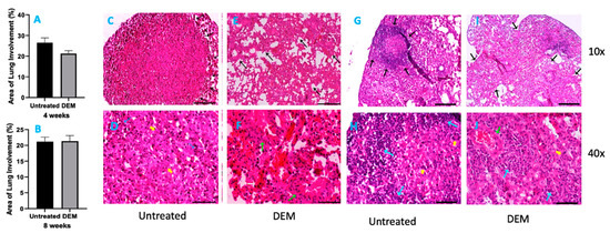Morphometric analysis and hematoxylin and eosin staining of lung tissue sections of M. tb-infected mice that were sham-treated or treated with DEM. Morphometric analysis was performed in the mouse lung sections stained with hematoxylin and eosin at 4 weeks (A) and 8 weeks (B) post-M. tb infection. 10× (C,E,G,I) and 40× (D,F,H,J) images of hematoxylin and eosin-stained lung sections of mice at 4 weeks (C–F) and 8 weeks (G–J) post-M. tb infection are presented. The sample size (n) includes six mice each in the untreated and DEM-treated groups.