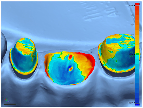 The “initial alignment” function was executed to superimpose the intraoral scanner mesh over the reference mesh followed by the “best fit alignment” that concentrates on the alignment of the isolated area of interest in order to secure a precise overlapping of the two meshes. In order to analyze the deviation between the reference and measured data, the “3D Compare” function was used by projecting all paired points onto the reference data. A color-coded map was rendered displaying the deviation patterns of the investigated surfaces. The color-coded map was set to display deviations between ±50 µm. On the color-coded map scale, outward displacement is presented towards the red spectrum while inward displacement is presented towards the blue spectrum. The areas with no deviation between the analyzed mesh and the reference one, are being presented in green as there is less than ±1 µm between the compared surfaces in that specific area (Figure 1).
