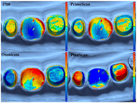 The clinical accuracy of impressions dictates the marginal and internal fit of the final restorations. However, all the following steps involved in the fabrication of the restoration may also introduce errors [25,26]. Even though CEREC Omnicam and Planmeca PlanScan are available on the market for almost nine years, the Omnicam IOS provides high-quality intraoral scans which are not far behind (difference of approx. 10 µm) of those obtained with the latest IOSs. On the other hand, the differences in trueness between the Planmeca PlanScan IOS when compared to Primescan and Medit i700 were significantly higher (difference of approx. 53 µm).