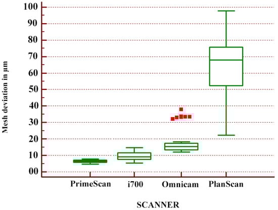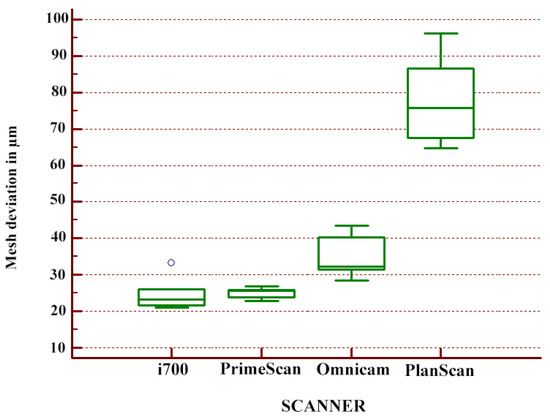 Regarding the precision of the investigated IOSs, the mean best performance was found for the Primescan IOS, followed by Medit i700, Omnicam and Planmeca IOSs. Primescan and Medit i700 displayed precision values that are very close within the same interval of 5 µm to 15 µm, with Primescan definitely keeping the median lower than 7 µm. Omnicam and Planmeca Planscan displayed values that differ significantly, with more outliers and resulting in a severe decrease of precision.