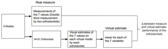 - Variables for which the estimates were not significantly different from the real values. This was the case for the following 3 variables:The overjet (t (30) = −1.60; p = 0.11);The curve of Spee (t (30) = −1.33; p = 0.19);The inter-molar distance (t (29) = 0.39; p = 0.69).